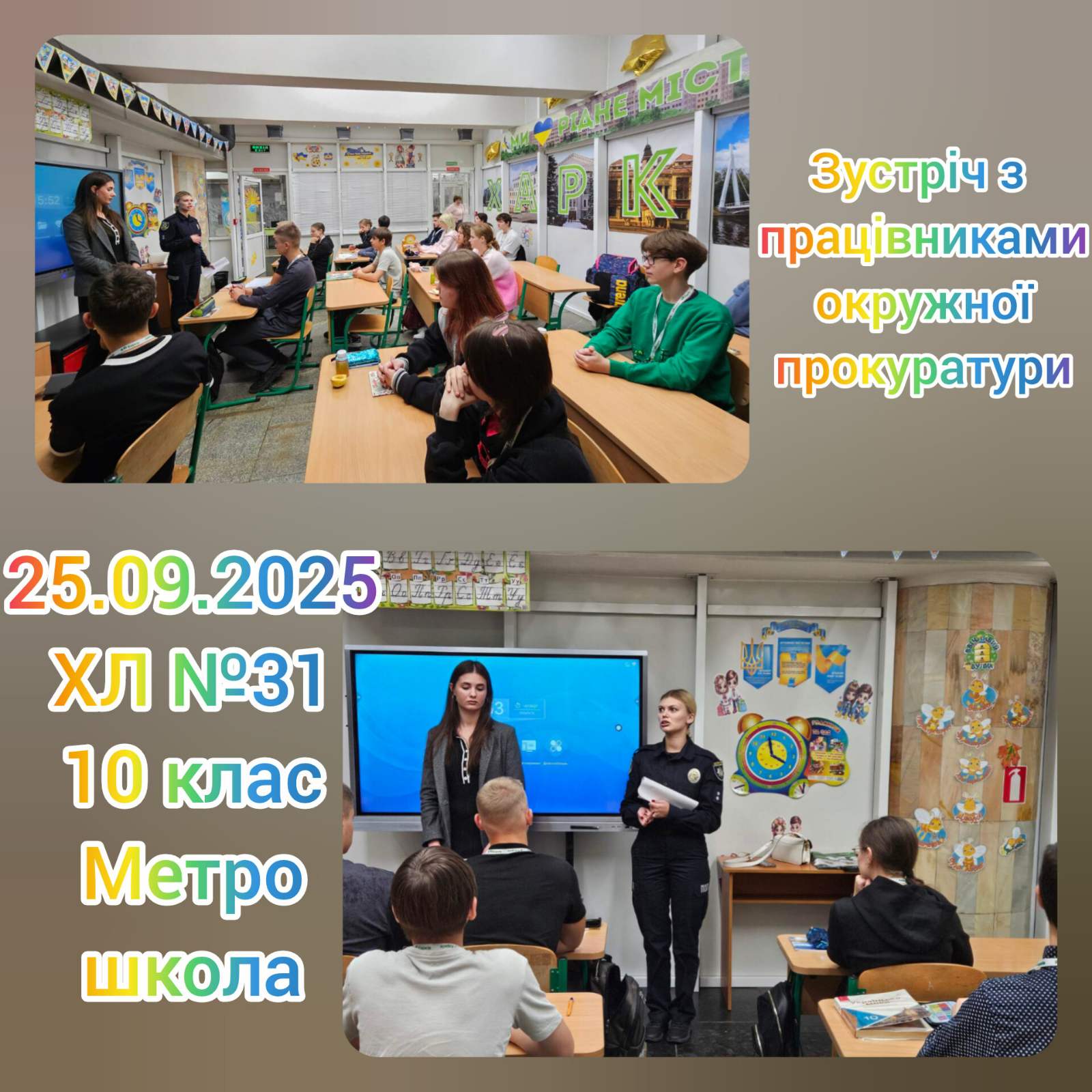 Спеціалісти окружної прокуратури разом із психологом 25.09.2025 року провели навчально-профілактичну лекцію з питань запобігання суїцидальних та інших негативних поведінкових проявів у дітей в закладах загальної середньої освіти Салтівського району для учнів 10 класу ХЛ №31, які навчаються в безпечній локації на станції метро “Академіка Павлова”. Лекція була змістовною та цікавою для підлітків.