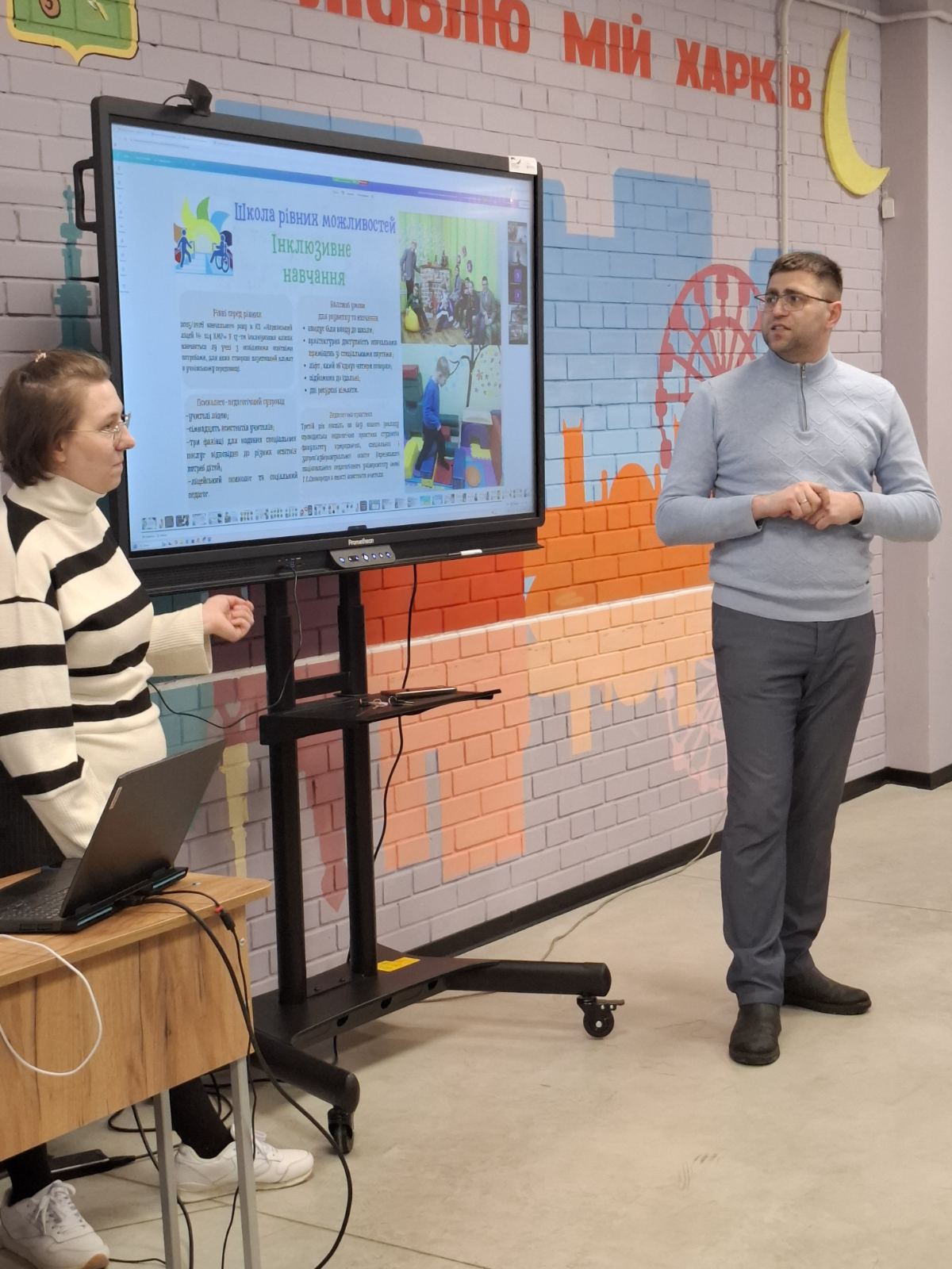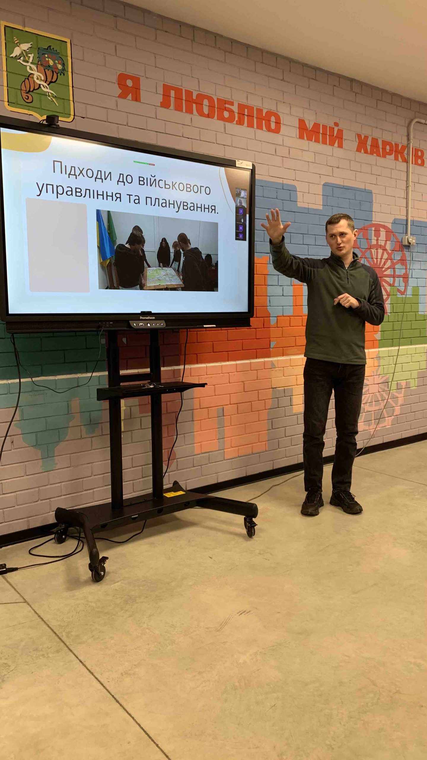 Андрій Миколайович Ткаченко, учитель предмета «Захист України» ХЛ №128, презентував доповідь «Формування національної стійкості в умовах сучасних викликів: інтеграція практичних занять у шкільний курс предмета «Захист України»» у супроводі мультимедійної презентації.