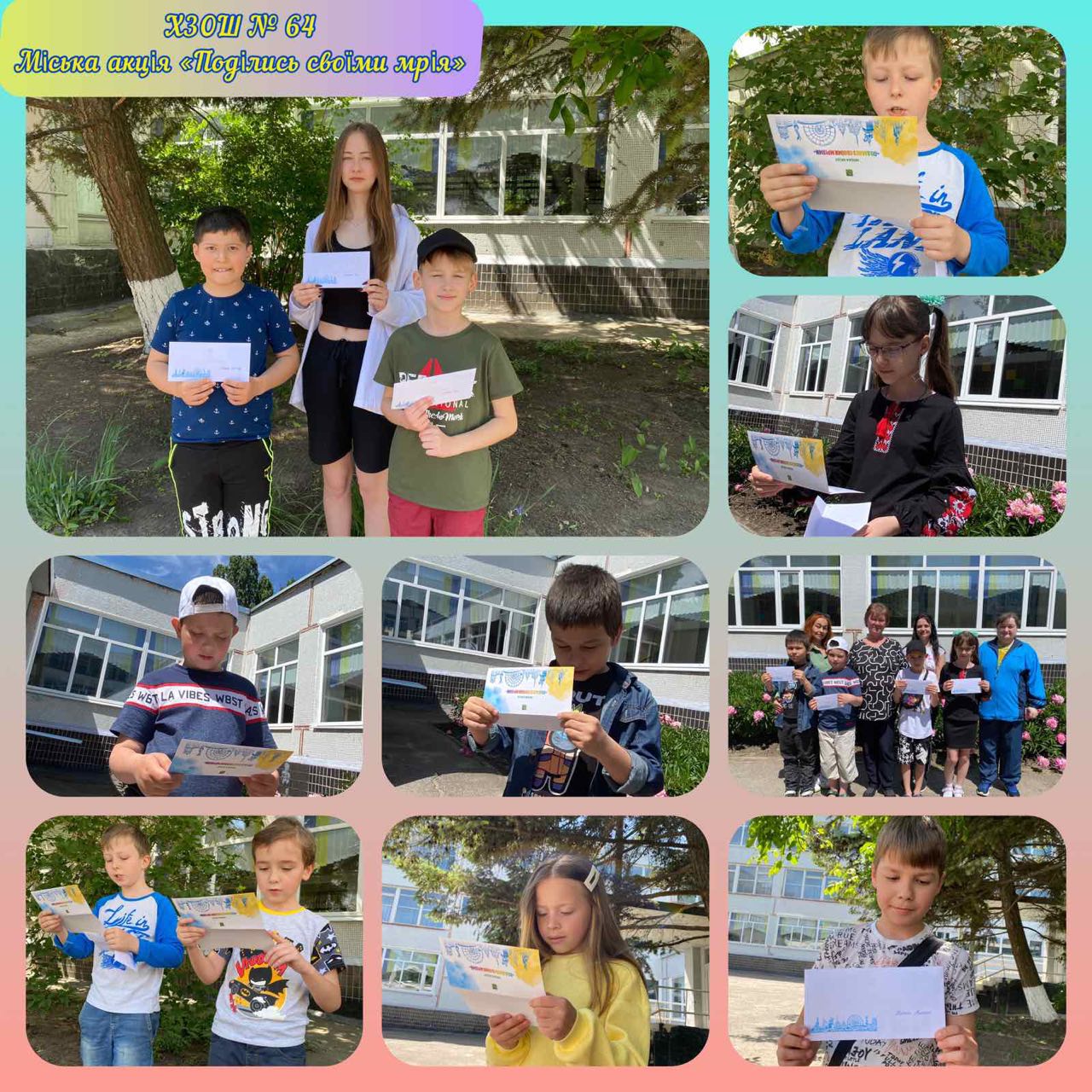 Любі друзі! Щиро дякуємо всім, хто взяв участь у міській акції «Поділися своїми мріями!». Це дуже важливо мати можливість розказати висловити свої потайні думки, про своє бачення майбутнього нашого Салтівського району, нашого міста Харкова, нашої України. Розказати про ким ви бачите себе у майбутньому і що ви можете запропонувати, щоб наше місто стало ще кращим. Найголовніша одна мрія на всіх – мирне небо над головою. Такі прості і такі важливі в житті кожної дитини бажання – зустрітися з друзями, прийти до школи, сісти за парту – нехай вони надихають дорослих та інших дітей на добрі справи та збуваються!