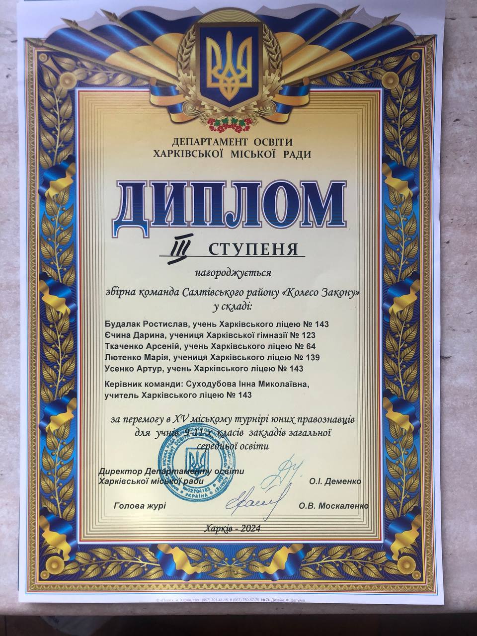 Вітаємо наших школярів: Ткаченка Арсенія (ХЛ №64), Єчину Дарію (ХГ №123), Будалака Ростислава (ХЛ №143), Усенка Артура (ХЛ №143), Лютенко Марію (ХЛ №139), а також їх керівника – учителя історії та правознавства ХЛ №143 Суходубову Інну Миколаївну з високим результатом, адже у турнірі змагалися 9 команд з усіх районів міста!