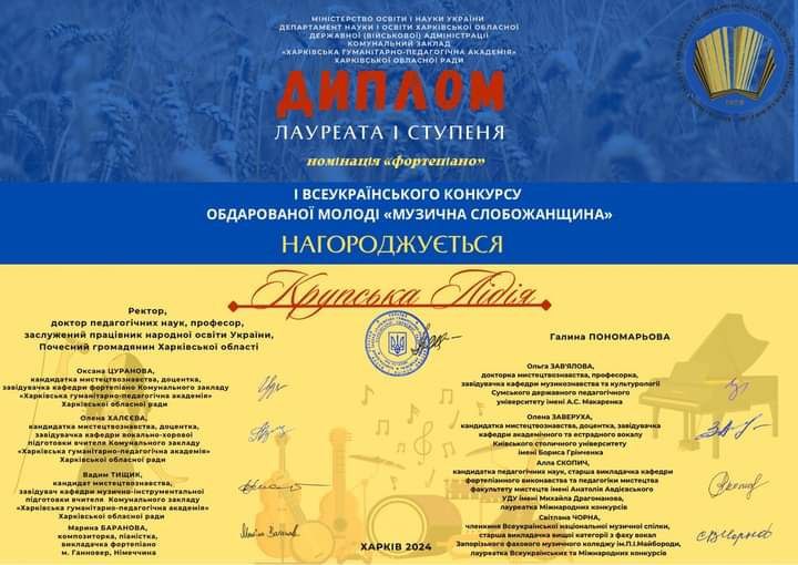 «МУЗИЧНА СЛОБОЖАНЩИНА»! Лідія посіла І місце в номінації “Фортепіано”. Бажаємо натхнення та нових перемог!