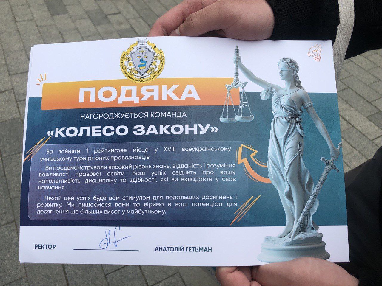 Команду юних правознавців Салтівського району “Колесо Закону”, а також учителів та директорів закладів освіти нагороджено спеціальними Подяками Анатолія Гетьмана, ректора Національного Юридичного університету імені Ярослава Мудрого. У березні-квітні школярі взяли участь у районному, міському та всеукраїнському етапах турніру юних правознавців, на яких продемонстрували високий рівень знань з основ правознавства. Ректор академії подякував школярам Салтівського району, відзначивши їх наполегливість, дисципліну та здібності.