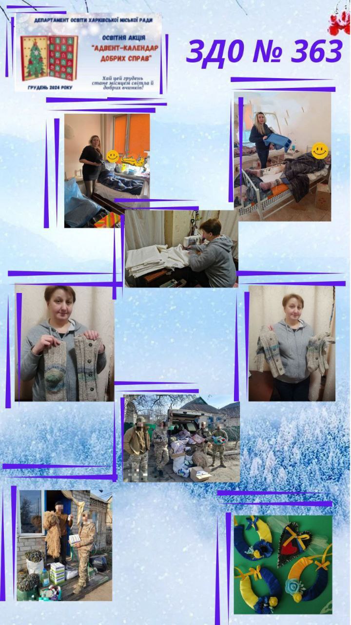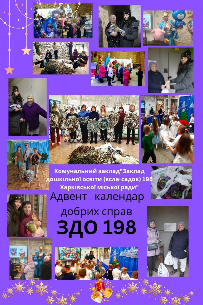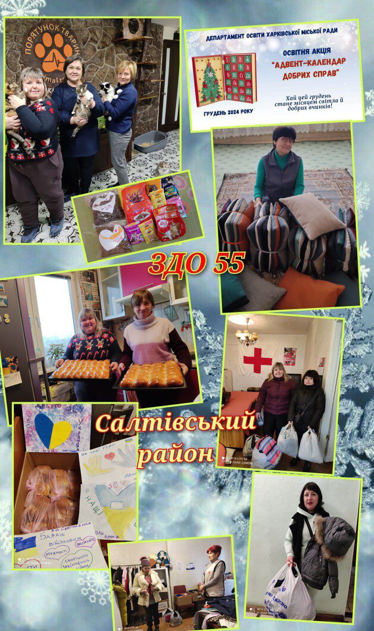 Робити добрі справи не так вже й важко, а під час війни необхідно. Тому, запропонована Департаментом освіти Харківської міської ради освітня акція “Адвент- календар добрих справ” у грудні 2024 року, набула вийняткового сенсу для працівників закладів дошкільної освіти Салтівського району, оскільки вони постійно знаходять час для добрих вчинків: допомогають нашим захисникам, підтримують людей вразливих категорій, дарують радість дітям, піклуюттся про беззахисних тварин та багато іншого. Кожен маленький внесок наближає нас до великої мети – вселити в серця надію та небайдужость до ближнього!