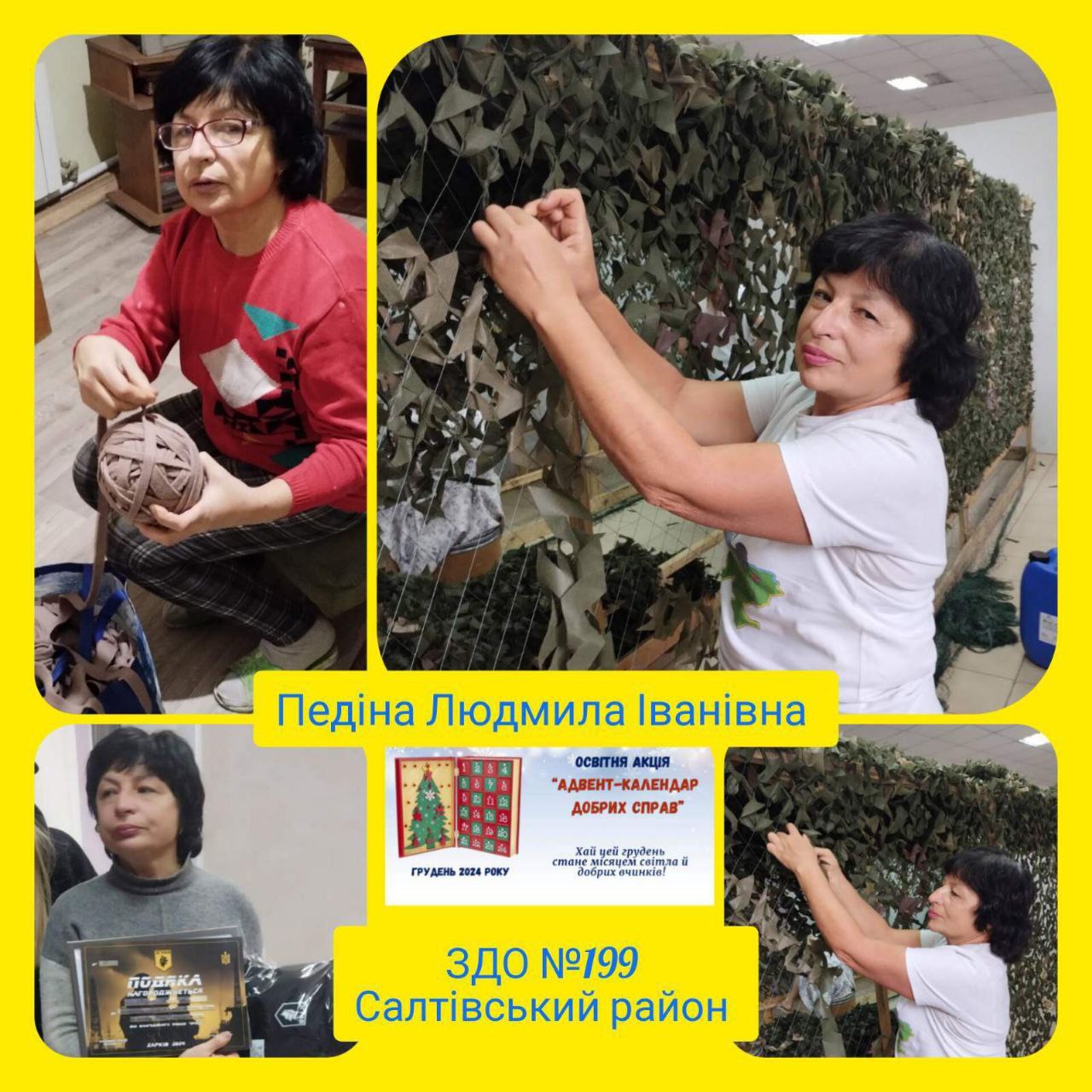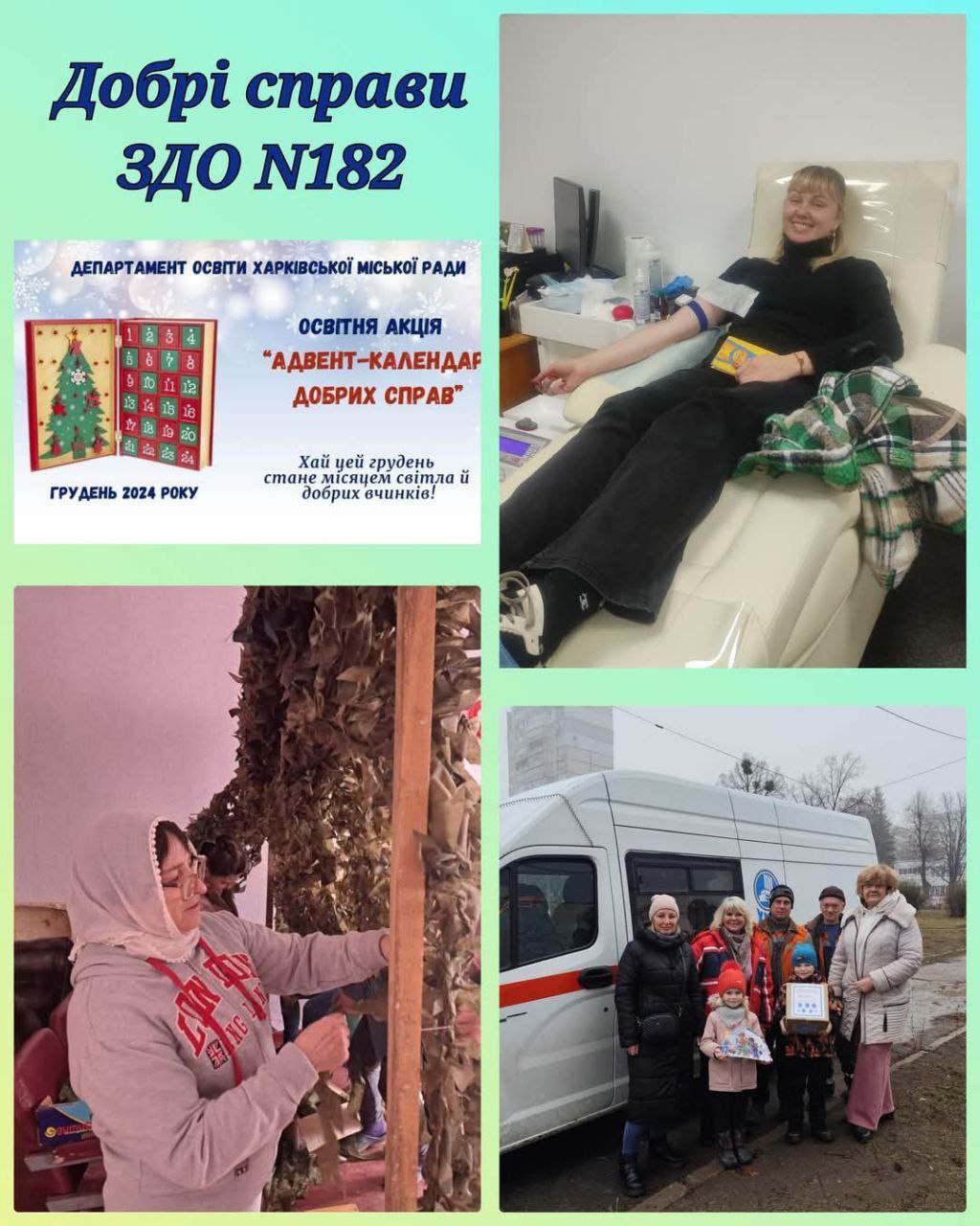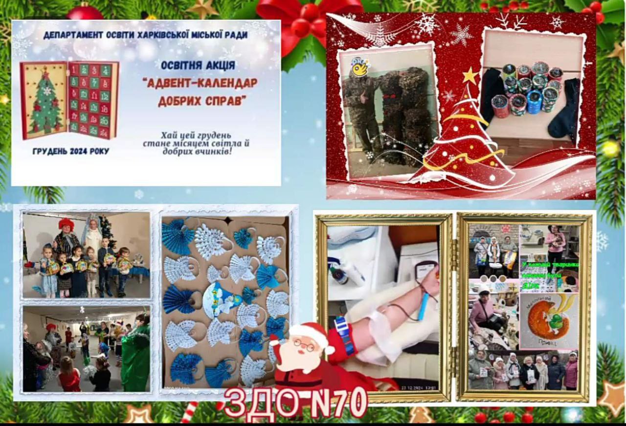 Робити добрі справи не так вже й важко, а під час війни необхідно. Тому, запропонована Департаментом освіти Харківської міської ради освітня акція “Адвент- календар добрих справ” у грудні 2024 року, набула вийняткового сенсу для працівників закладів дошкільної освіти Салтівського району, оскільки вони постійно знаходять час для добрих вчинків: допомогають нашим захисникам, підтримують людей вразливих категорій, дарують радість дітям, піклуюттся про беззахисних тварин та багато іншого. Кожен маленький внесок наближає нас до великої мети – вселити в серця надію та небайдужость до ближнього!